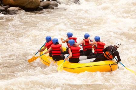 A group of men and women, with a guide, white water rafting on the Patate river, Ecuador