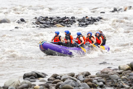 a group of men and women, with a guide, white water rafting on the patate river, ecuador