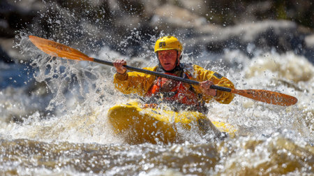 A kayaker in a yellow outfit expertly maneuvers through choppy waters, splashes flying around as the sun shines down on the scenic river.