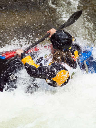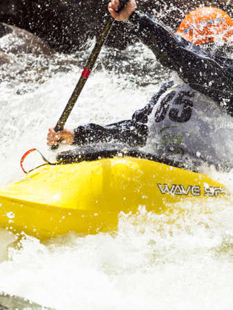 Kayak slalom canoe race in white water rapid river, process of kayaking competition with the colorful canoe kayak boat paddling, process of canoeing with big water splash