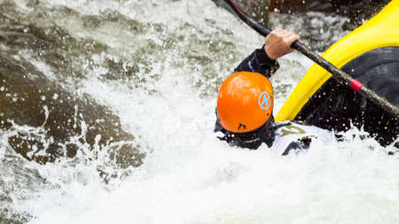 Guy in kayak sails mountain river. Whitewater kayaking, extreme sport rafting