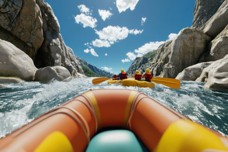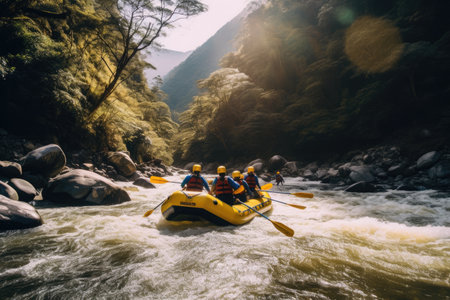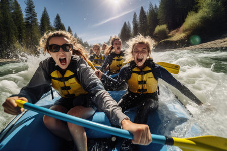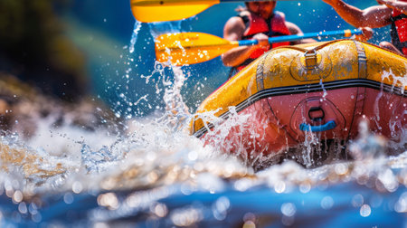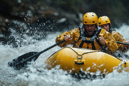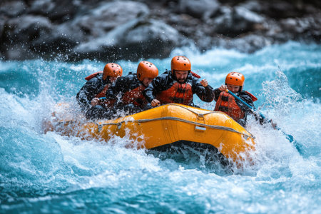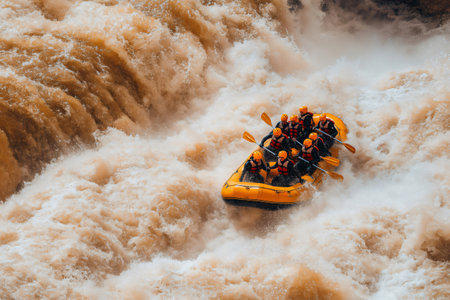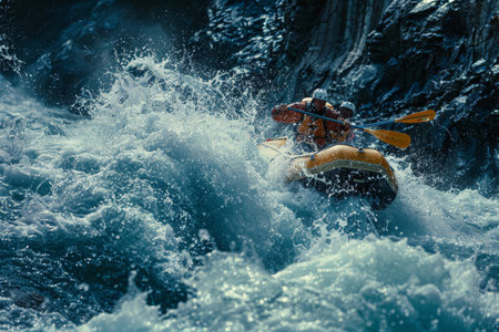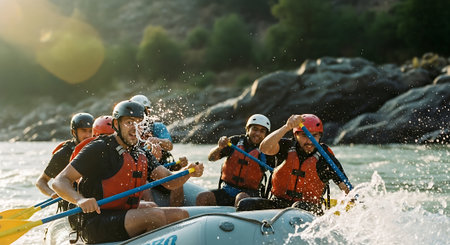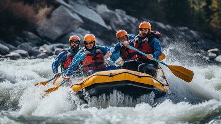 Dynamic action shot of adventurers white water rafting in bright gear amidst thrilling rapids