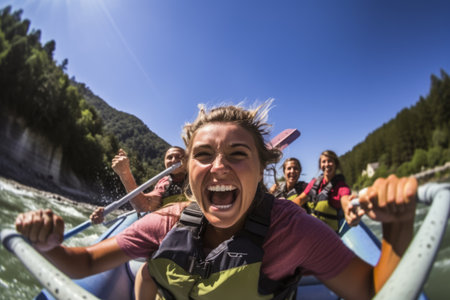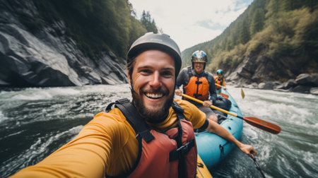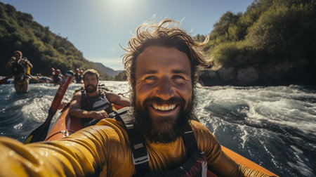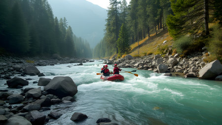 Immerse yourself in the thrilling adventure captured in this photograph. Set against the backdrop of a scenic river, the image depicts a team of courageous individuals engaged in the exhilarating sport of rafting. Generative AI
