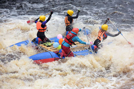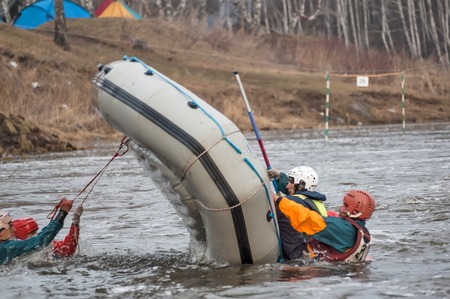Beklenischevo, Russia - April 29, 2006: Rafting as extreme and fun sport. Athletes work actions when capsizing a raft