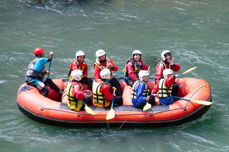 team of people navigating a raft on a wild river, working together, sports in the nature concept