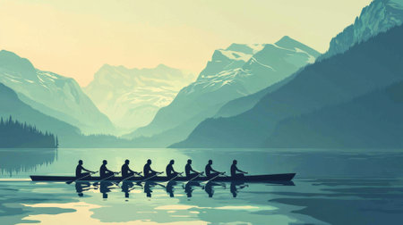A group of rowers are on a boat in a lake surrounded by mountains. Scene is peaceful and serene, as the rowers are enjoying the beautiful scenery around them