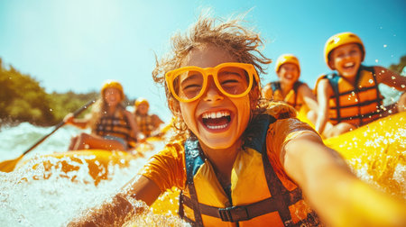 A group of children enjoy a thrilling rafting experience, splashing water everywhere while wearing life jackets and bright yellow helmets, all smiles under the sun on a summer day.