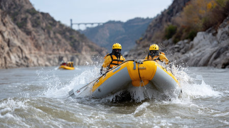 Two adventurers navigate the wild waters of a river in a bright yellow raft, creating splashes and showcasing the thrill of outdoor rafting.
