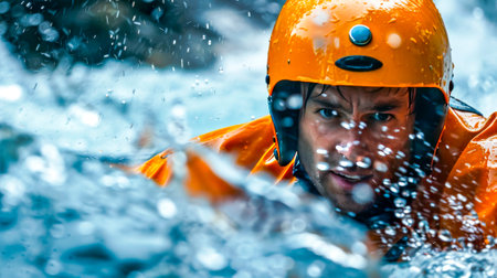 An intense moment capturing a kayaker maneuvering through the splash of the frothy rapids, decked in bright safety gear.