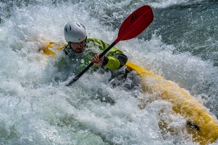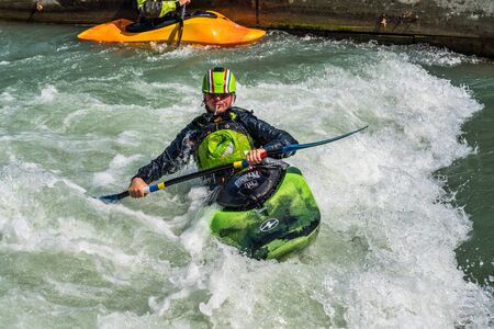Augsburg, Germany - June 16, 2019: Whitewater kayaking, extreme kayaking. A guy in a kayak sails on the Eiskanal in Augsburg Germany