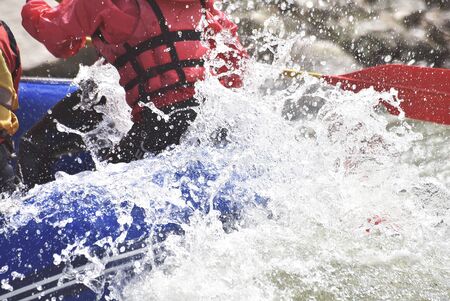 Raft boat during whitewater rafting extreme water sports on water rapids, kayaking and canoeing on a river, water sports team with a big splash of water
