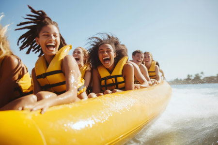 Group of cheerful young friends wearing life jackets enjoying a fun summer day riding a banana boat on the sea