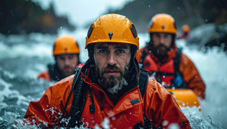 Rescue teams work tirelessly in heavy rain to save individuals from a raging river. The setting is a wild and remote area, with rushing waters creating dangerous conditions for those in need.