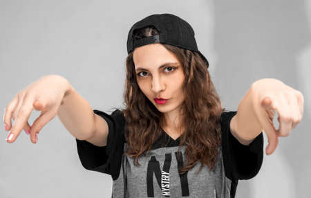 Black afroamerican rebellious rapper on grey background. Rejection, closed, reluctance to see, breaking off. Ghetto, challenge to society, cheeky, cool