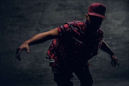 Portrait of an African-American dancer guy dressed in a red fleece shirt and cap at the studio. Isolated on dark textured background.