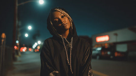 A young woman showcases her contemporary style while standing on a bustling city street at night. The vibrant atmosphere highlights her confident pose against a backdrop of street lights and urban life.
