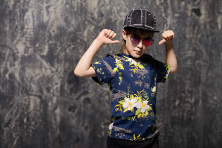 Portrait of a cool trendy ten-year-old boy in modern clothes. Children's fashion. Hip-hop style.
