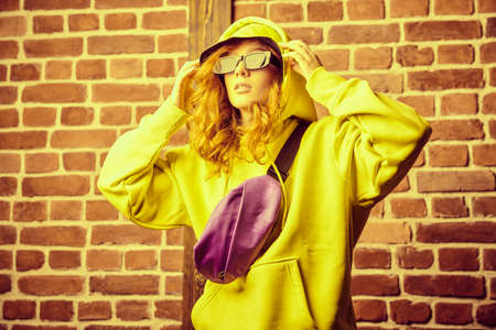 Modern young hip-hop dancer girl in yellow hoodie dancing contemporary urban street dance. Brick wall background.