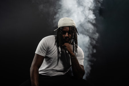 Salvador, Bahia, Brazil - August 30, 2025: A man with dreadlocks and a white hat poses for a photo isolated on a smoky black background in a studio. Salvador, Brazil.