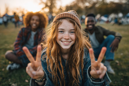 Smiling girl with curly hair makes peace signs while sitting on grass with friends in a vibrant outdoor scene, capturing joyful moments during sunset