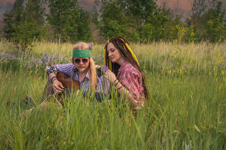 Guy and a girl in hippie style with a guitar are sitting in the grass on a forest glade on a sunny day