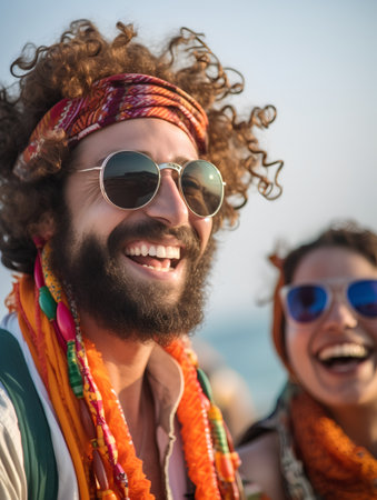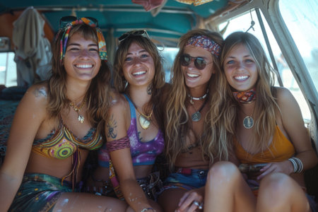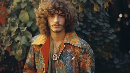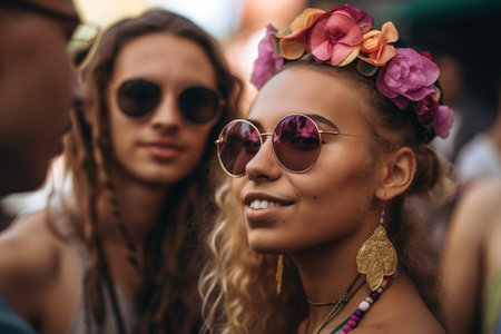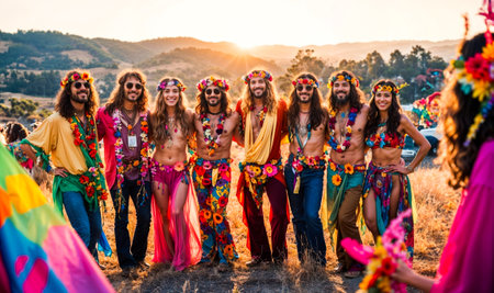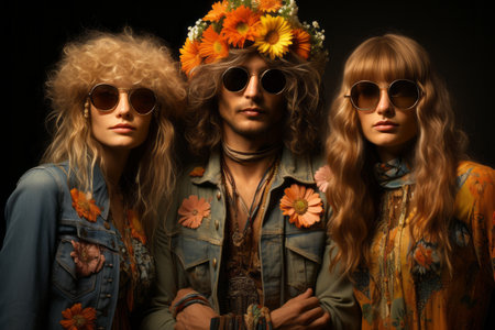 Portraits of people dressed in hippie fashion, with flower crowns, round sunglasses, and bell-bottom jeans, showcasing their unique style. Generative AI