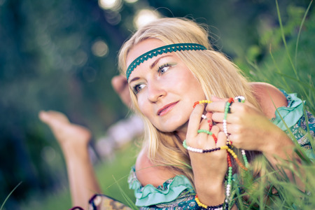 A portrait of a fashion female model lying on the grass. Contemporary bohemian style. Spirit of freedom. Fashion shot. Bohemian, bo-ho style.