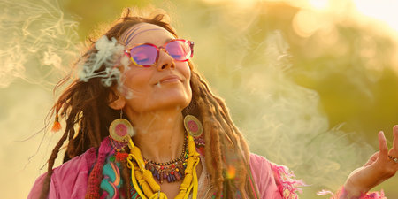 Portrait of hippie woman with dreadlocks in sunglasses and pink boho clothes