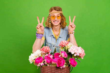 Hippie man with bouquet of colorful flowers. Fashion floral retro love person. Generate AI