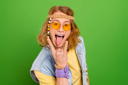 Portrait of carefree person tongue out arm fingers demonstrate heavy metal symbol isolated on green color background