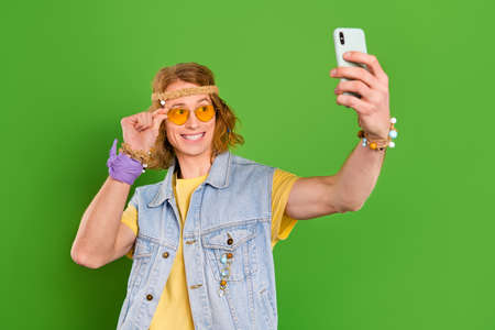 Photo of youngster guy make self portrait gadget tourism wear stylish trendy jeans vest isolated bright color background
