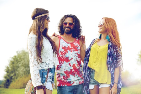 nature, summer, youth culture and people concept - smiling young hippie friends in sunglasses talking outdoors