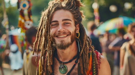 Diverse people enjoy spiritual gathering A closeup portrait of a young caucasian shaman, wearing glasses with a bare chest and eyes closed, looking happy and relaxed in meditation. Bohemian hippy style