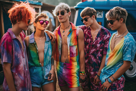 A kaleidoscope of color bursts onto the street as friends in vibrant cultural costumes celebrate Laughter and music fill the air, while elaborate accessories, from feathered headpieces to intricate jewelry, shimmer in the sun The parade pulsates with joyous energy, a vibrant tapestry of community and celebration AI Generative