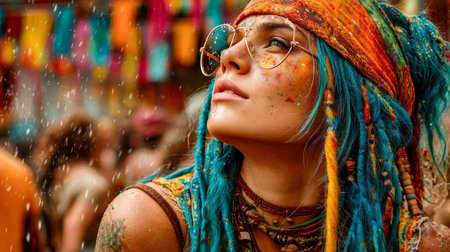 young caucasian hippie woman with colorful painted makeup, eclectic, earthcore style, mystic symbolism, forestpunk, blurred rainbow patterns