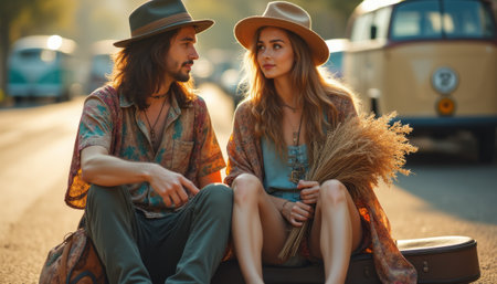 A charming scene captures a young man and woman sitting together on a guitar case, exuding a relaxed, bohemian vibe. The warm sunlight bathes them in a golden glow, highlighting their stylish outfits and the bouquet of wheat in her hands, symbolizing love and connection.