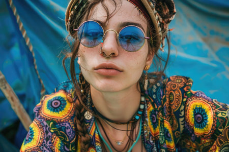 A young woman, dressed in bohemian jewelry and a patterned shirt, stars into the distance with a serene expression. Blue sunglasses and backdrop offer a captivating contrast.