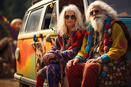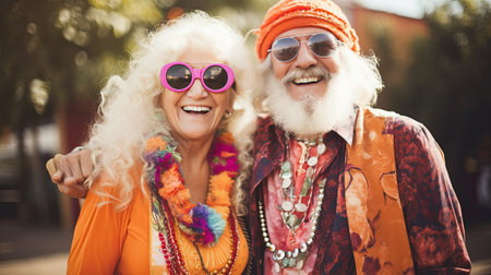 Senior hippies at party, man and woman