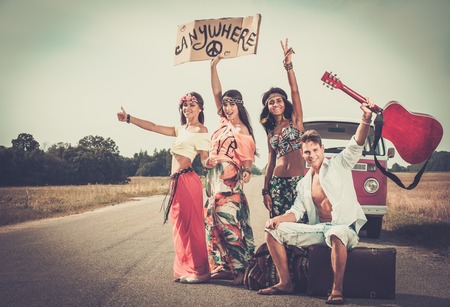 Multi-ethnic hippie hitchhikers with guitar and luggage on a road