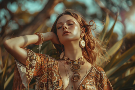 Pretty model in exotic location, wearing bohemian outfit and accessories with natural makeup, simple hairstyle. Attractive woman portrait with closed eyes. Generative AI