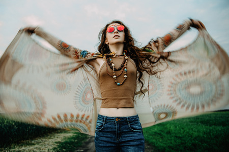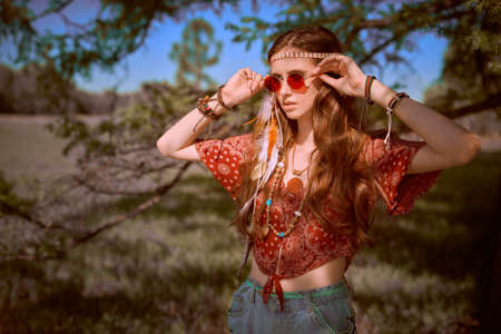 Portrait of a beautiful hippie girl in sunglasses outdoor. Spirit of freedom and adventures. Summer holidays.