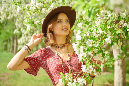 Beauty and fashion. A romantic smiling girl in hippie style clothes and accessories enjoys the beauty of blossoming trees in nature. Boho and hippie style. Spring season.
