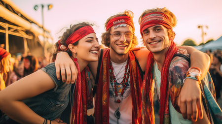 Group of young people with hippie clothes and flowers is posing all together at a music festival.