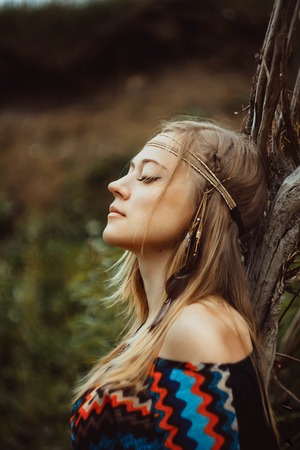 Magnificent fashion woman posing in boho style clothes in the rays of the sunset. Outdoor fashion. Gypsy style.