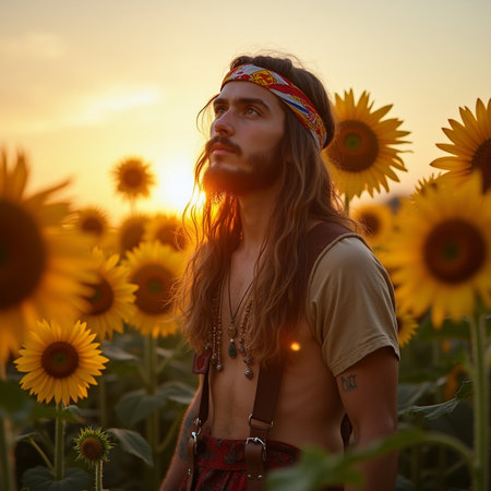 Portrait of young hippie man in sunflower field at sunset