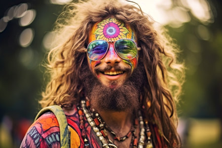 young bearded hippie man with colorful painted makeup, eclectic, earthcore style, mystic symbolism, forestpunk, close up portrait