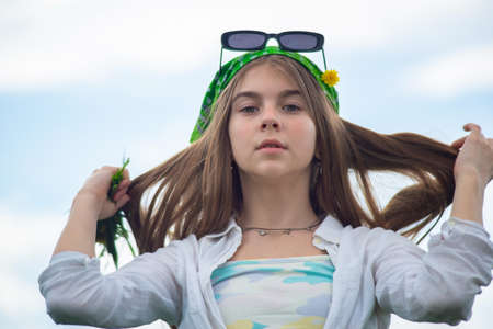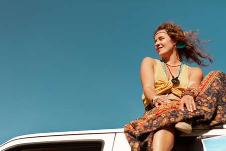 Portrait of a beautiful hippie girl against the blue sky and midday sun. Spirit of freedom and adventures. Summer holidays. Copy space.