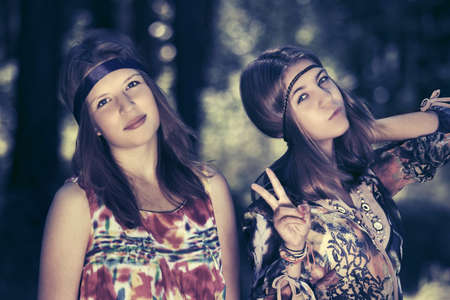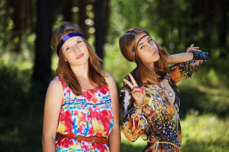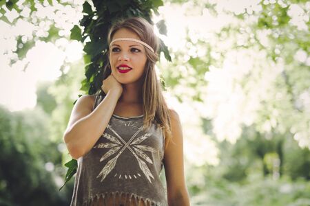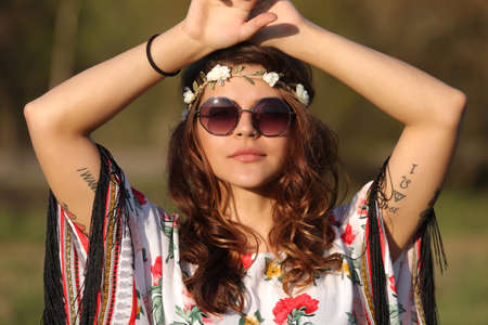 Beautiful young woman hippie posing outdoor.