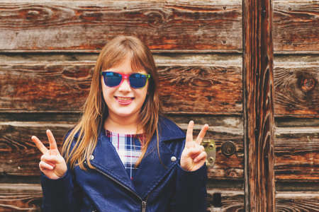 Outdoor fashion portrait of funny 9-10 year old girl wearing sunglasses and blue leather jacket
