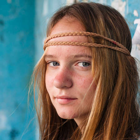 Close-up portrait of young sweet girl hippie outdoor (Woodstock concept)